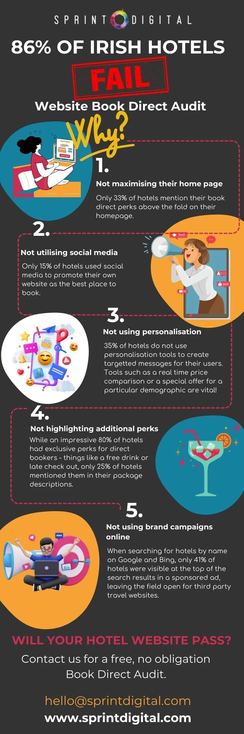 Sprint Digital, our leading digital marketing and web development agency, has conducted a comprehensive audit of 60 independent hotel websites across Ireland. The audit evaluated the signals and incentives that encourage customers to book on a hotel’s official website rather than a third-party online travel agency which incurs higher commission.